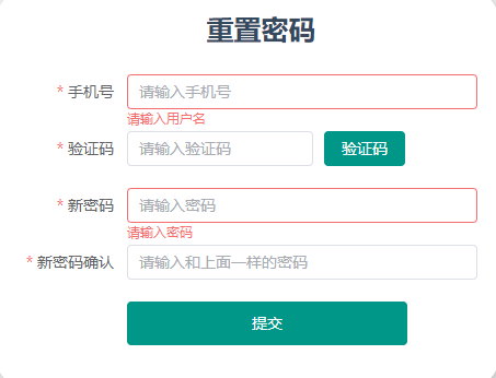 进入重置密码页面后,需要输入当时注册的手机号码后,点击“验证码”按钮,带手机收到验证码后,输入验证码。并输入新的登录密码和密码确认。点击“提交”,即可完成密码重置操作。